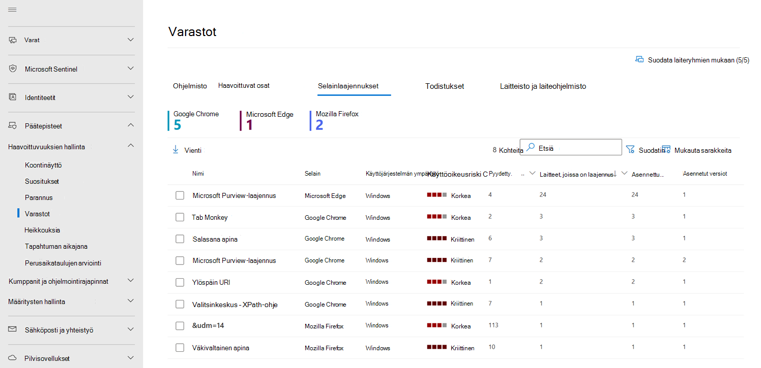 Tämä selainlaajennus on pieni ohjelmistosovellus, joka lisää toimintoja selaimeen käytettäväksi Microsoft Defenderin haavoittuvuuksien hallinta kanssa. Tämän laajennuksen avulla tietoturvatiimisi voi tarkastella asennettuja selainlaajennuksia varmistaakseen laajennusten turvallisen käytön organisaatiossasi.