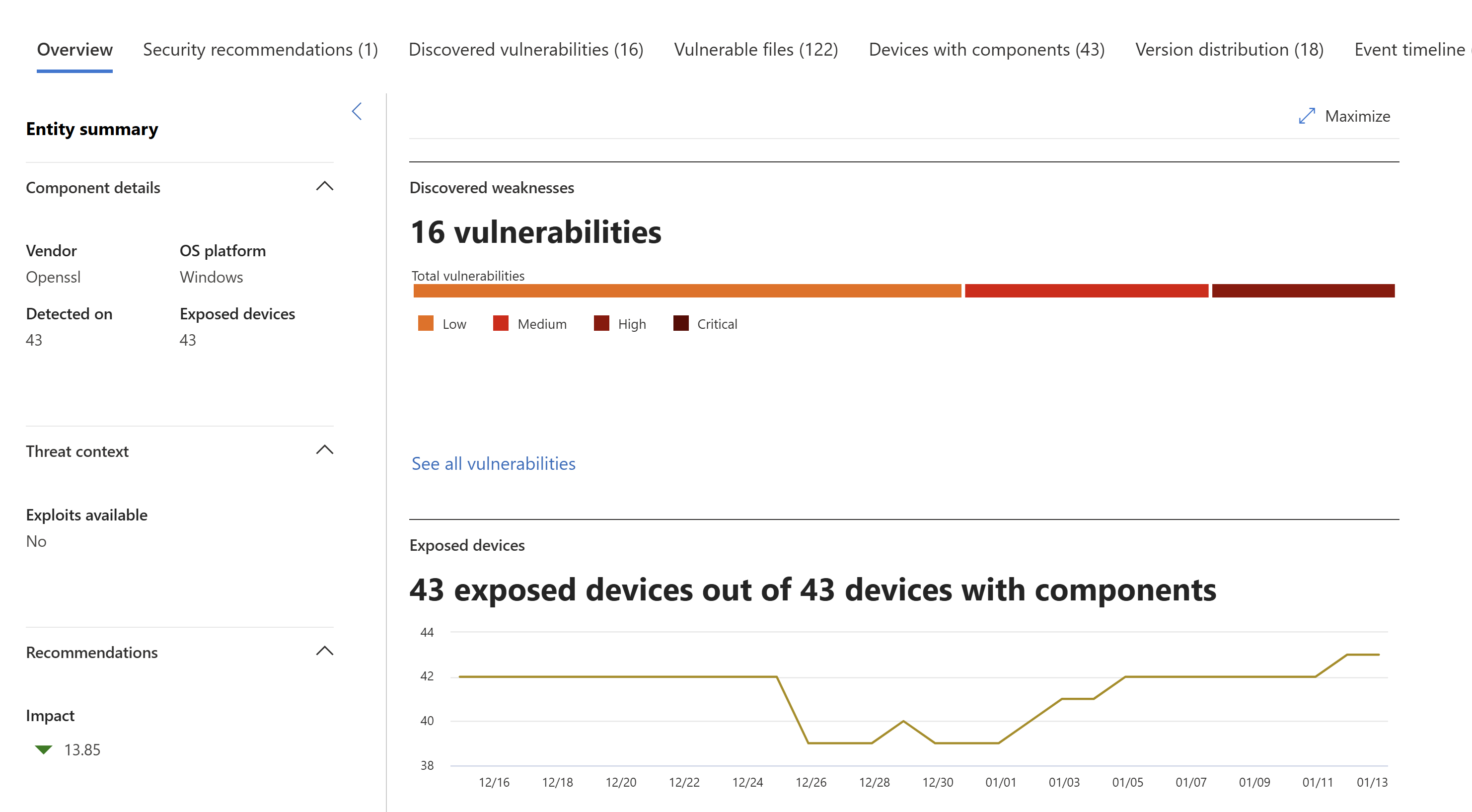 Sivulla on tietoja komponentin toimittajasta, laitteista, joihin osa on asennettu, ja tietojen visualisoinneista, jotka näyttävät löydettyjen haavoittuvuuksien määrän ja näytetyt laitteet.