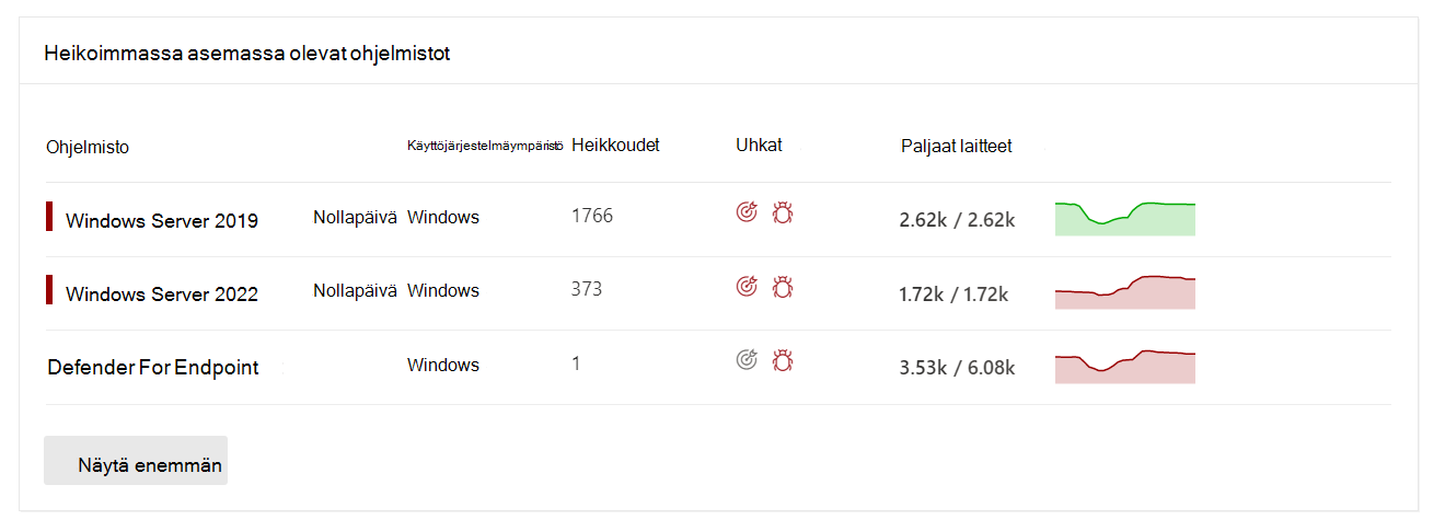 Etsi heikoimmassa asemassa oleva ohjelmistokortti . Tämä saattaa olla käytettävissä Yleiskatsaus - tai Koontinäyttö-sivulla sen mukaan, oletko XDR/MDI Preview -asiakas. Lisätietoja on kohdassa Microsoft Defenderin haavoittuvuuksien hallinta ja Microsoft-suojauksen altistumishallinta integrointi.