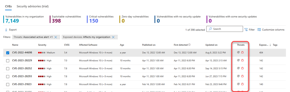 On tärkeää priorisoida suosituksia, jotka liittyvät jatkuviin uhkiin. Uhkien sarakkeessa olevien tietojen avulla voit priorisoida haavoittuvuuksia. Voit tarkastella jatkuvien uhkien haavoittuvuuksia suodattamalla Uhat-sarakkeen :