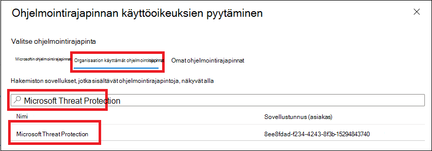 4. Valitse sovellussivulla ohjelmointirajapinnan käyttöoikeudetLisää käyttöoikeuksien>ohjelmointirajapinnat>, joita organisaationi käyttää>, kirjoita Microsoft Threat Protection ja valitse Microsoft Threat Protection. Sovelluksesi voi nyt käyttää Microsoft Defender XDR.