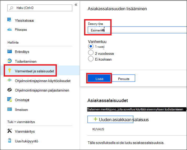 7. Lisää sovellukselle salaisuus valitsemalla Varmenteet & salaisuuksia, lisäämällä kuvauksen salauskoodiin ja valitsemalla sitten Lisää.