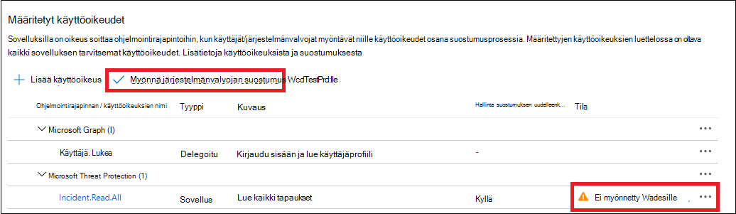 sovelluksen käyttöoikeusruutu Microsoft Defender portaalissa