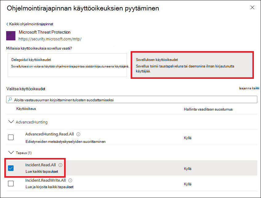 5. Valitse Sovelluksen käyttöoikeudet. Valitse skenaarioon liittyvät käyttöoikeudet (esimerkiksi Incident.Read.All) ja valitse sitten Lisää käyttöoikeuksia.