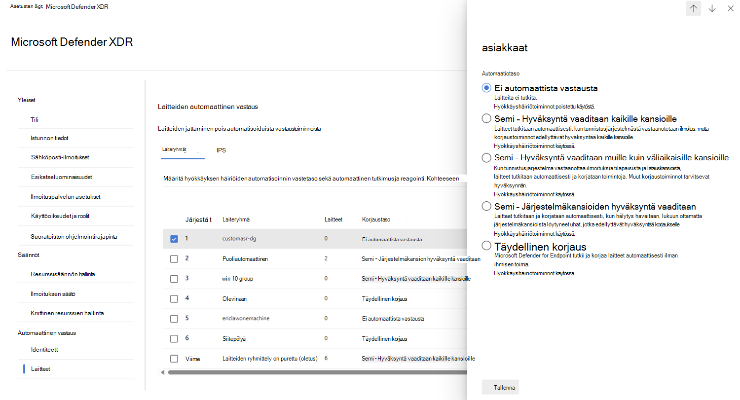 Valitse pikaikkunaruudussa laiteryhmän asianmukainen automaatiotaso. Voit valita laiteryhmällesi soveltuvia automaatiotasoja: