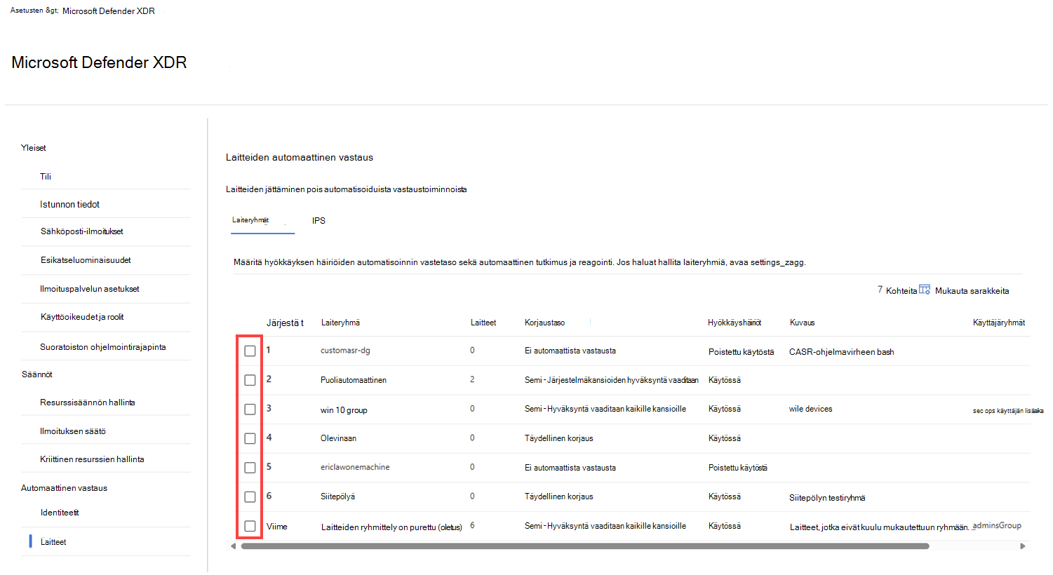 Valitse Laiteryhmät-välilehdessä laiteryhmä valitsemalla luettelosta ryhmän nimen vieressä oleva valintaruutu hyökkäyshäiriöiden automaatioasetusten määrittämiseksi.