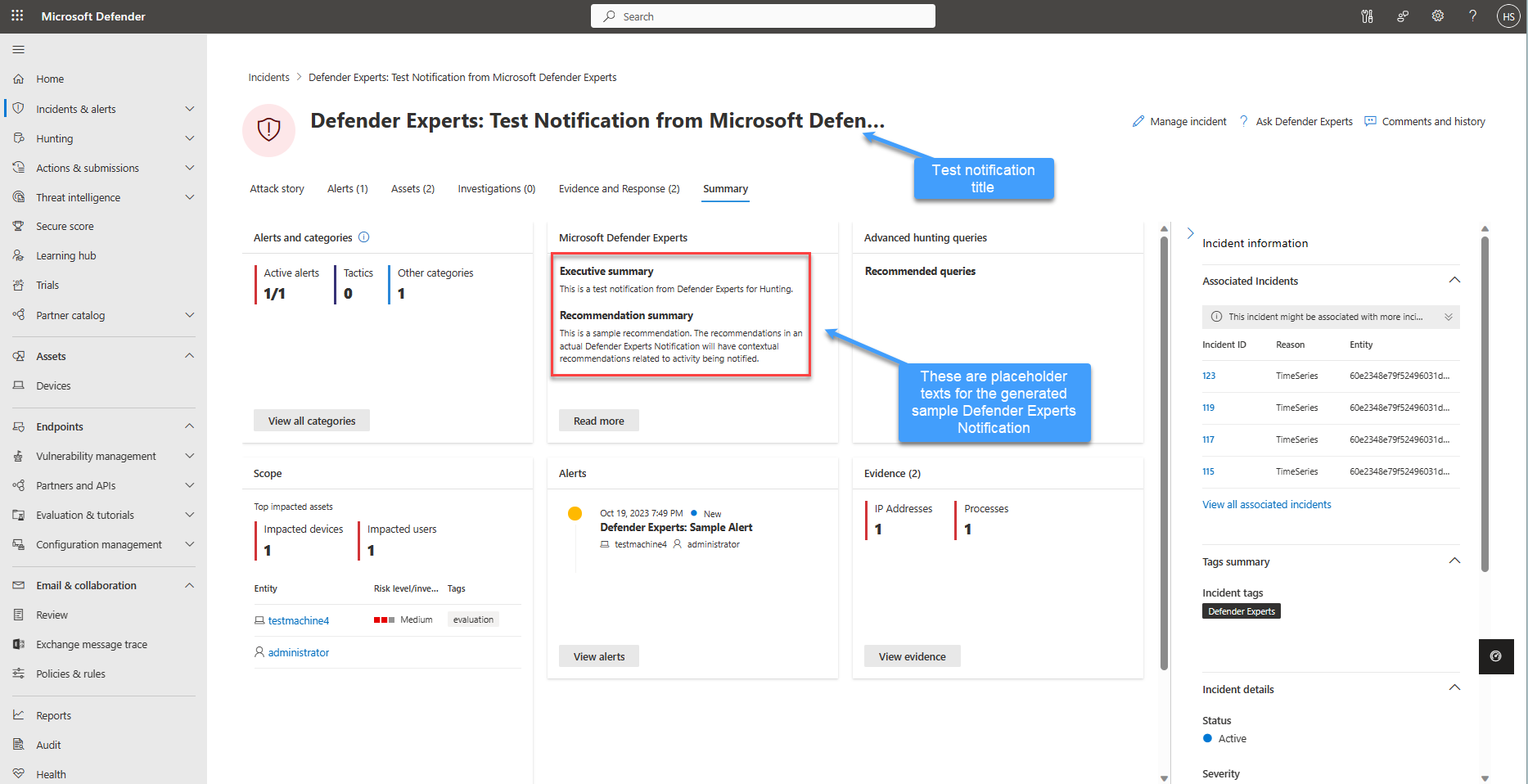 Voit luoda Defender Experts Notification -malliilmoituksen, jos haluat kokea Defenderin etsintäasiantuntijat-palvelun ilman, että sinun tarvitsee odottaa todellista kriittistä toimintaa ympäristössäsi. Luomalla malliilmoituksen voit myös testata sähköposti-ilmoituksia, jotka olet ehkä aiemmin määrittänyt tämän palvelun Microsoft Defender-portaalissa, sekä testata pelikirjojen määrityksiä (jos ne on määritetty tällaisia ilmoituksia varten) ja sääntöjä suojaustiedot- ja tapahtumienhallintaympäristössäsi (SIEM).