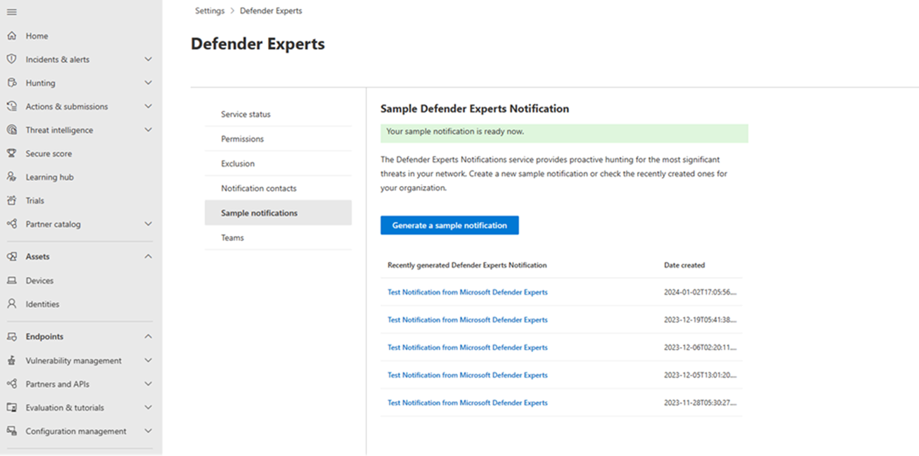 Defender Experts Notifications -palvelu sisältää seuraavat:
