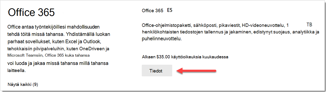 Valitse Office 365 osiossa Tiedot kohdassa Office 365 E5 käyttöoikeus.