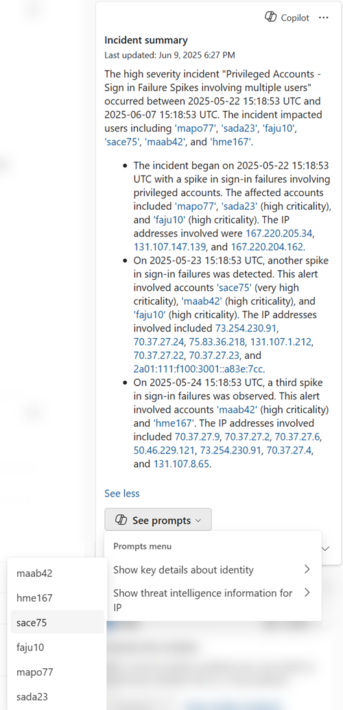 Erillisessä Security Copilot portaalissa voit luoda tapahtumayhteenvedot seuraavan kehotteen avulla: