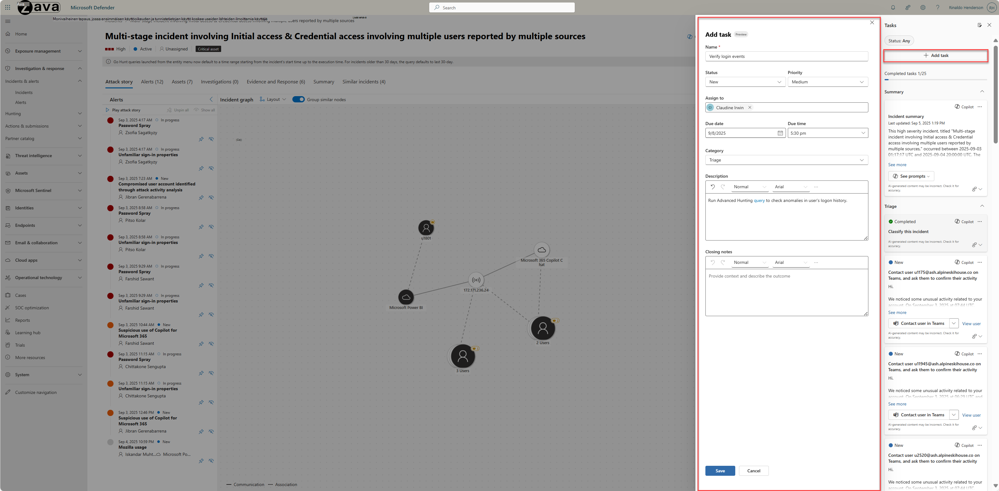 Käytä Microsoft Defender portaalin tehtäviä tapausten tutkimiseen ja ratkaisemiseen yhteistyössä eri toimintoryhmissä. Tapausten murtaminen toiminnallisiin tehtäviin parantaa toiminnan tehokkuutta ja vahvistaa vastuuvelvollisuutta koko prosessin ajan.