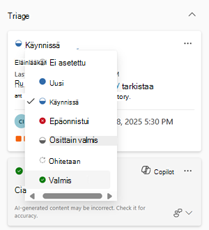 Jos haluat päivittää tehtävän tilan, valitse tila tehtävän esikatselukortin avattavasta Tila-valikosta .