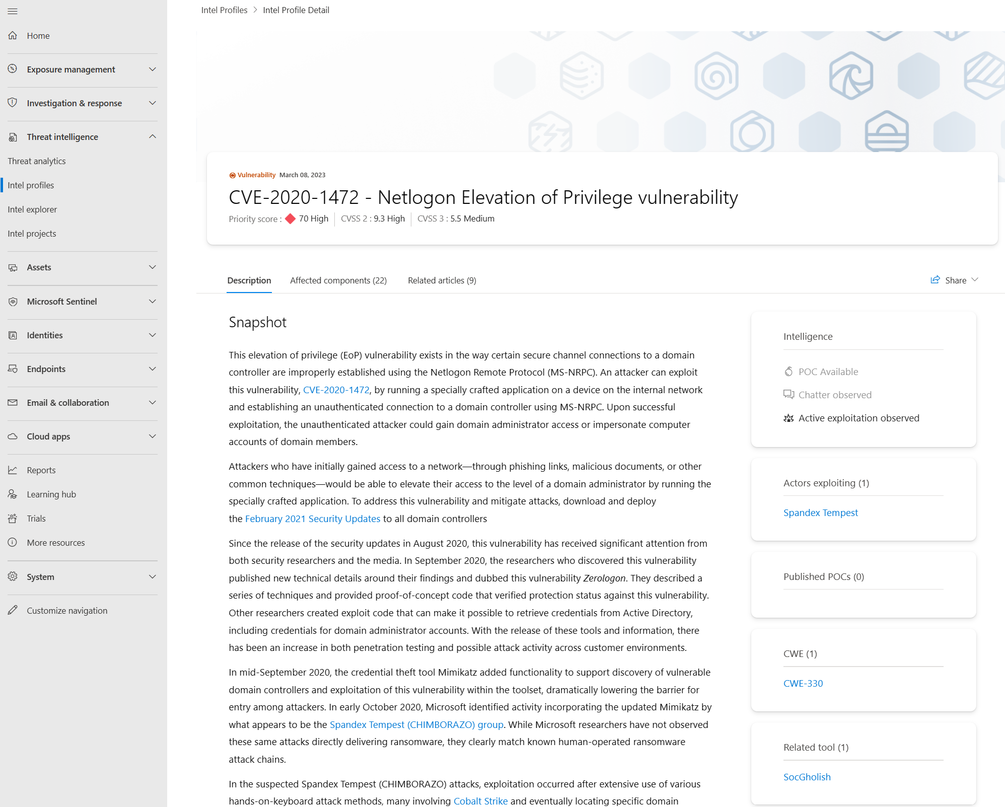 Hae CVE-2020-1472Intel Explorerin hakupalkista, valitse ja tarkista liittyvä Intel-profiili CVE-2020-1472 - Netlogon Elevation of Privilege -haavoittuvuus.