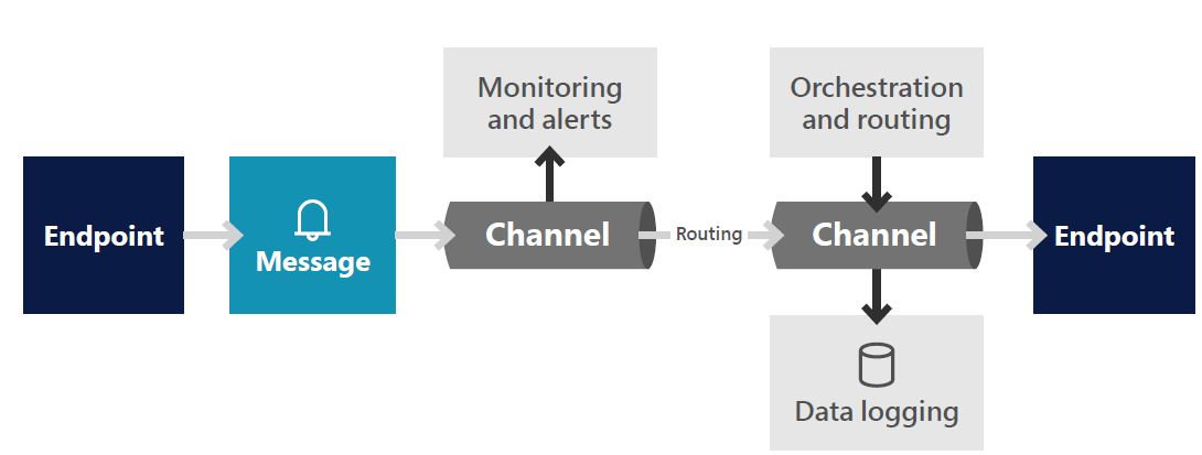 Messaging patterns shine because they manage the flow of information, spot outages, and hold onto messages until everything's back up and running. The following diagram shows the typical components of a messaging platform: