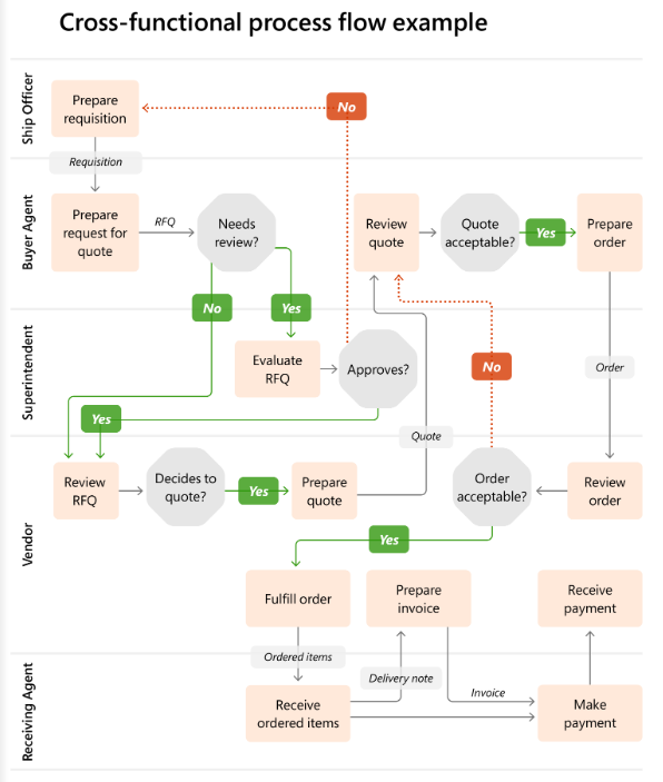 The following illustration shows an example of a cross-functional process flow mapped to the business users or personas.
