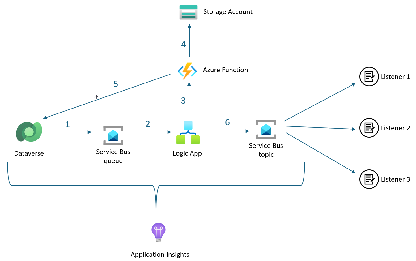- A Logic App (Standard) listens to these changes. The Logic App calls a Function app to retrieve the relevant data by using FetchXML. The Storage Account stores the FetchXML definition.