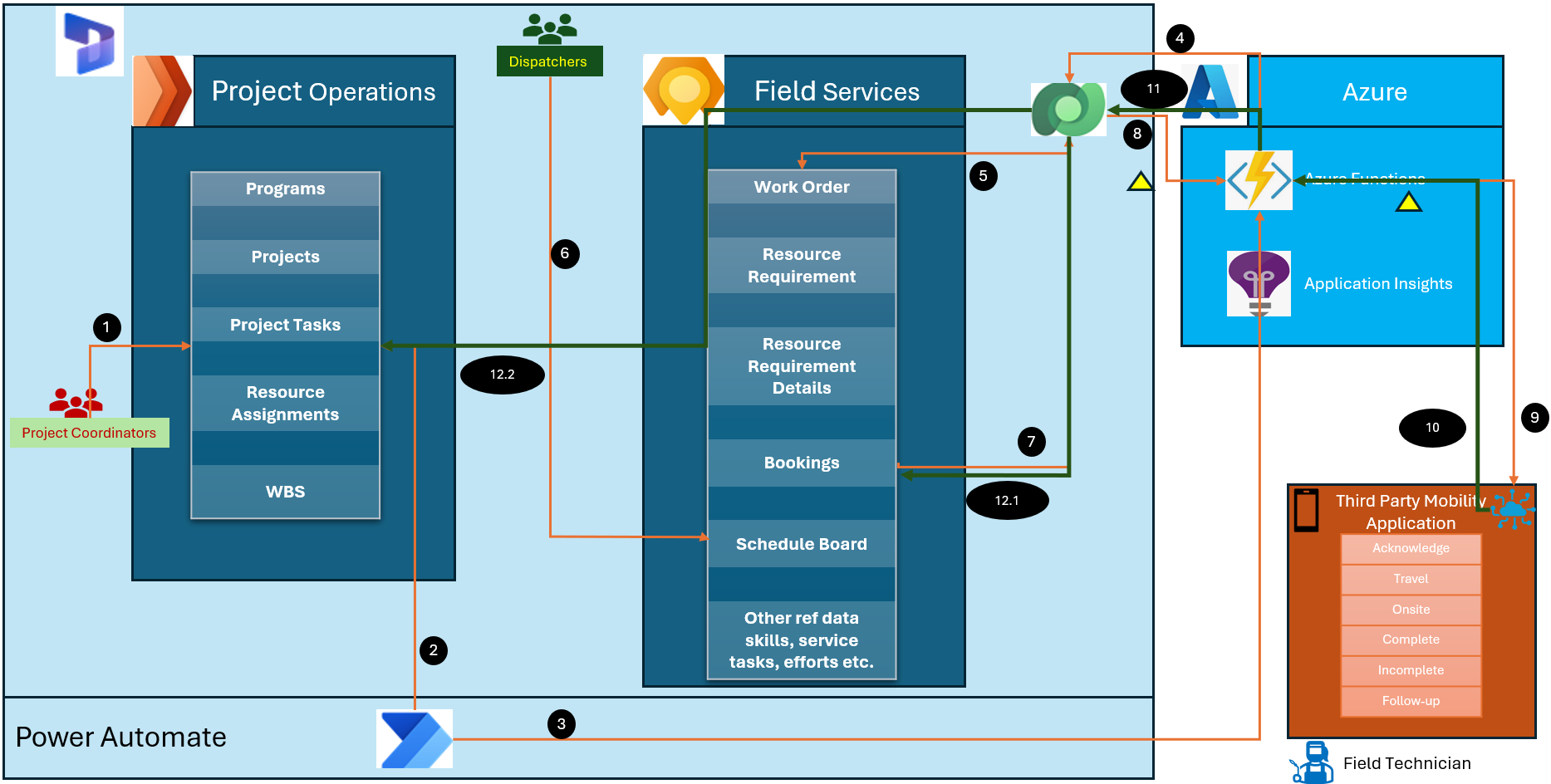 Mobility application from an external service provider - Dispatchers send booking information to this app through an Azure Function, so field technicians get real-time updates on their devices. This way, everyone knows what to do, when to do it, and where to go. Dynamics 365 Field Service mobility isn't used because of various in-house client challenges.
