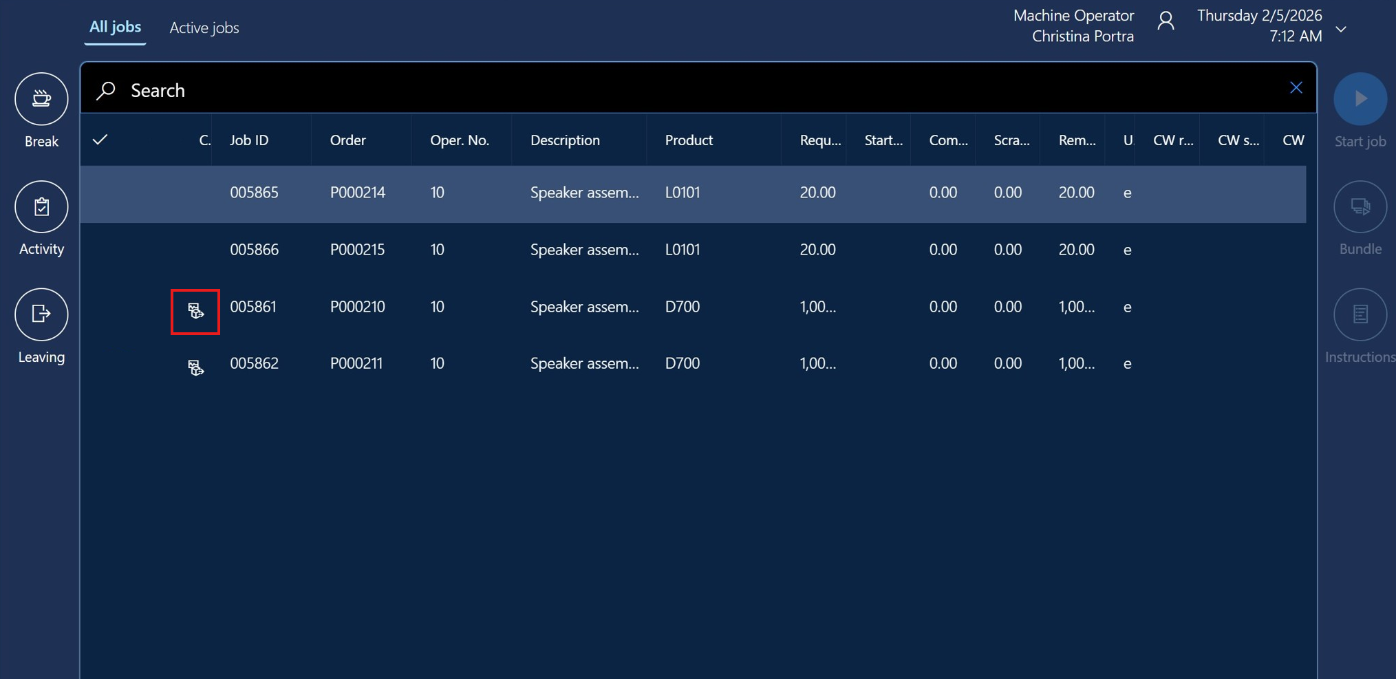 Automaattinen raportointi anturisignaalin avulla määritetyissä työtöissä näkyy erillinen kuvake työluettelossa tuotannon lattian suorituksen liittymässä, kuten seuraavassa kuvassa on esitetty.