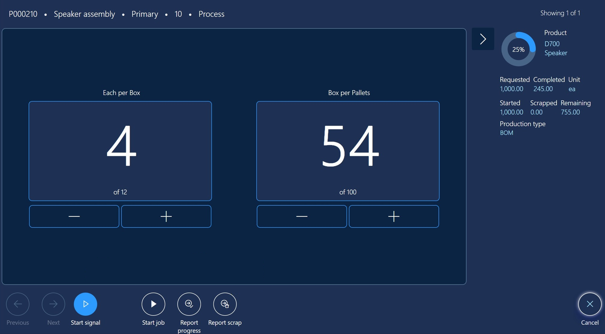 Jos työluettelossa on käytössä useita töitä tunnistimen ohjaamalle raportoinnille, käytä Näytä laskuri -valintaikkunan Edellinen- ja Seuraava-painikkeita vaihtaaksesi työpaikasta toiseen sulkematta valintaikkunaa.