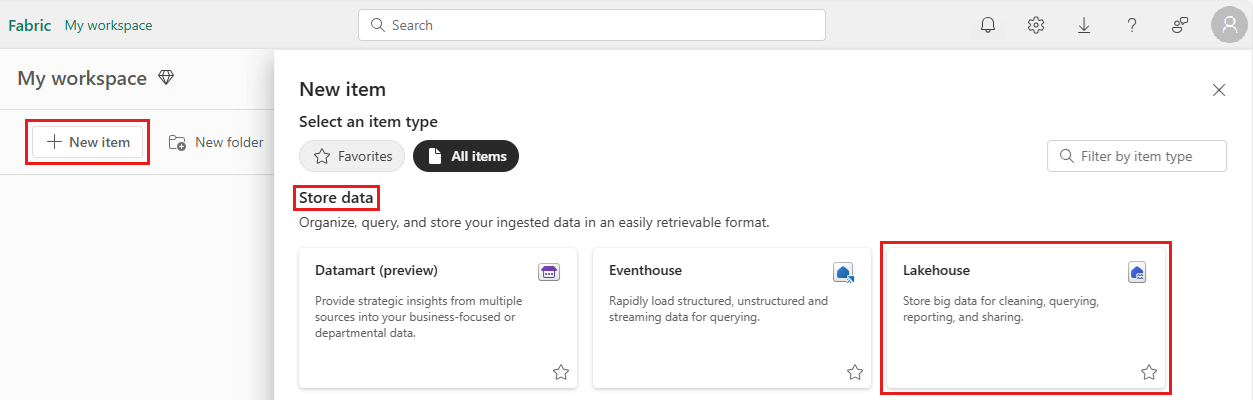 Jos haluat luoda lakehousen, valitse työtilasta Uusi kohde ja valitse sitten avautuvasta paneelista Lakehouse .