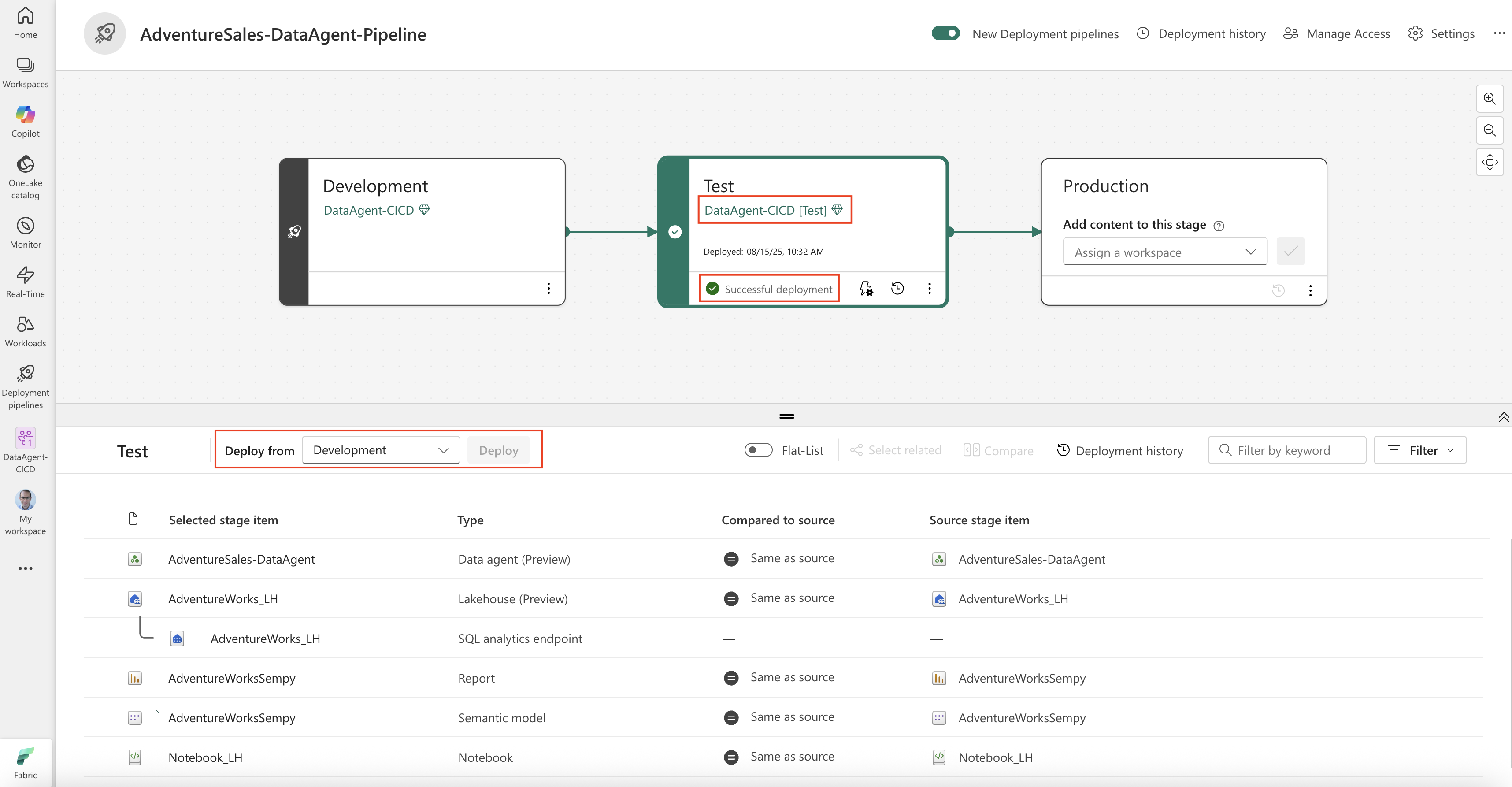 Fabric-tietoagentin julkaiseminen mahdollistaa sen käytön kaikissa eri kulutuskanavissa, mukaan lukien Copilot for Power BI, Microsoft Copilot Studio ja Azure AI Foundry Services. Jotta voit arvioida ja käyttää data-agenttia näissä kanavissa, tietoagentti on julkaistava. Julkaisemattomat tietoagentit eivät ole käytettävissä kulutukseen, vaikka ne olisivat tuotantotyötilassa. Jotta voit noudattaa parhaita käytäntöjä käyttöönottoputken mukaisesti, ota huomioon, että: