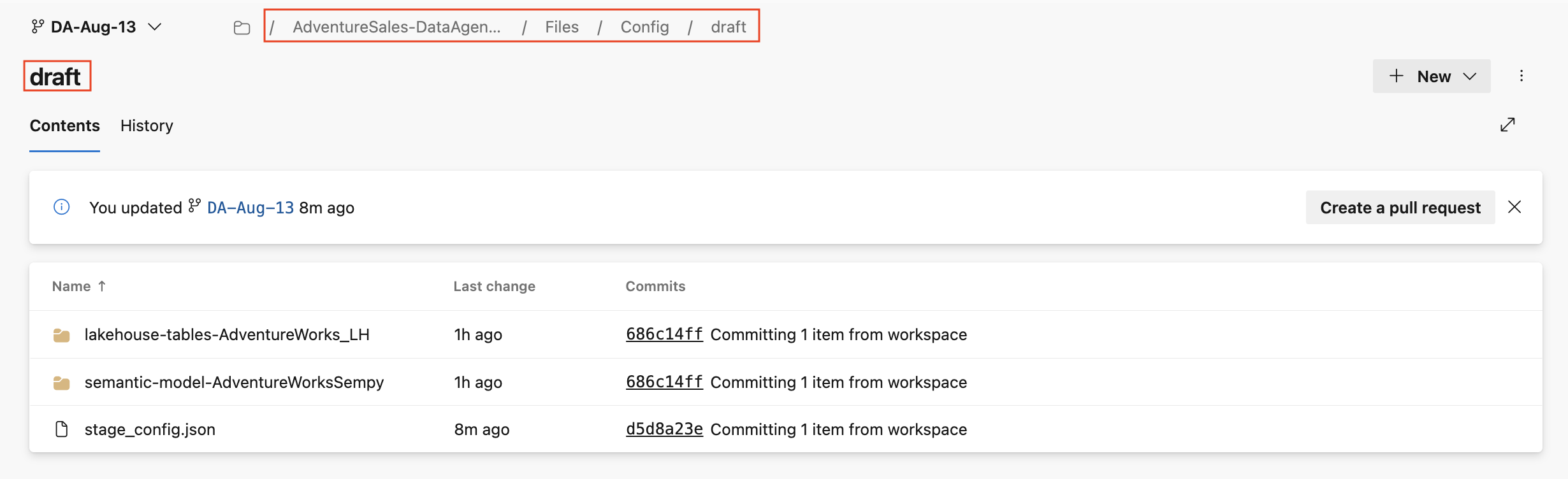 - Linkitetty Git-säilö näyttää kansiorakenteen, joka edustaa työtilan kohteita, mukaan lukien Fabric-tietoagentit ja niiden määritystiedostot. Jokainen tietoagentti on tallennettu omaan kansioonsa, jolloin voit tarkastella muutoksia, seurata versiohistoriaa ja käyttää Git-työnkulkuja, kuten luoda pull-pyyntöjä päivitysten yhdistämiseksi päähaaraan.