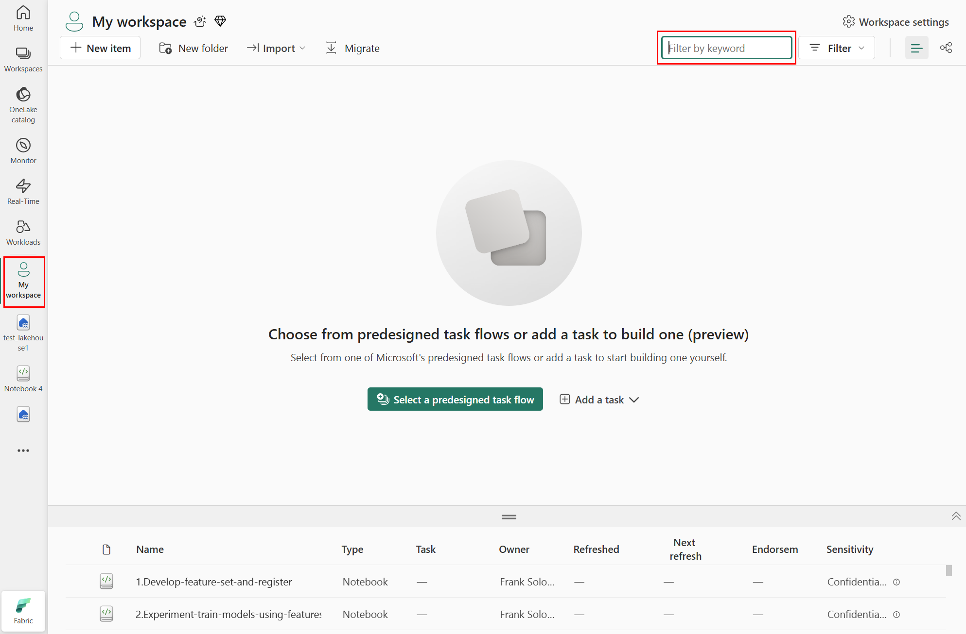Valitse vasemmassa siirtymisruudussa työtilasi ja kirjoita sitten oikean yläkulman tekstiruutuun muistikirjaasi liitetyn lakehousen nimi. Seuraavassa näyttökuvassa näkyy, että olemme valinneet Oman työtilan:
