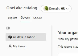 Päästäksesi Govern-välilehdelle, valitse OneLake-katalogin kuvake Fabric-navigointipaneelista ja valitse sitten Govern.