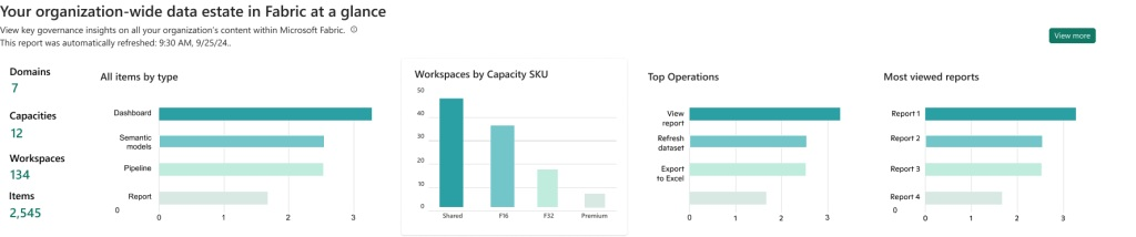 Fabric-ylläpitäjille oivallusosio tarjoaa korkeatasoisia näkemyksiä koko Fabric-vuokralaisesta (Fabric-vuokralainen). Valitse Näytä lisäänähdäksesi kaikki saatavilla olevat näkemykset.