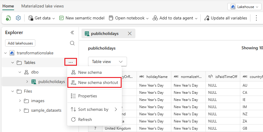 Lakehousessasi napsauta Tables-kansiota hiiren oikealla ja valitse Uusi skeema-pikakuvake.