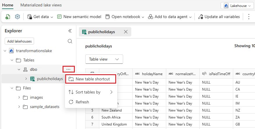 Lakehousessasi napsauta hiiren oikealla skeemaa Tables-kansion alta ja valitse sitten New table pikakuvake. Valitse pikakuvakelähde, kuten Azure Data Lake, Azure Blob Storage, Dataverse, Amazon S3, GCP, SharePoint tai OneDrive.