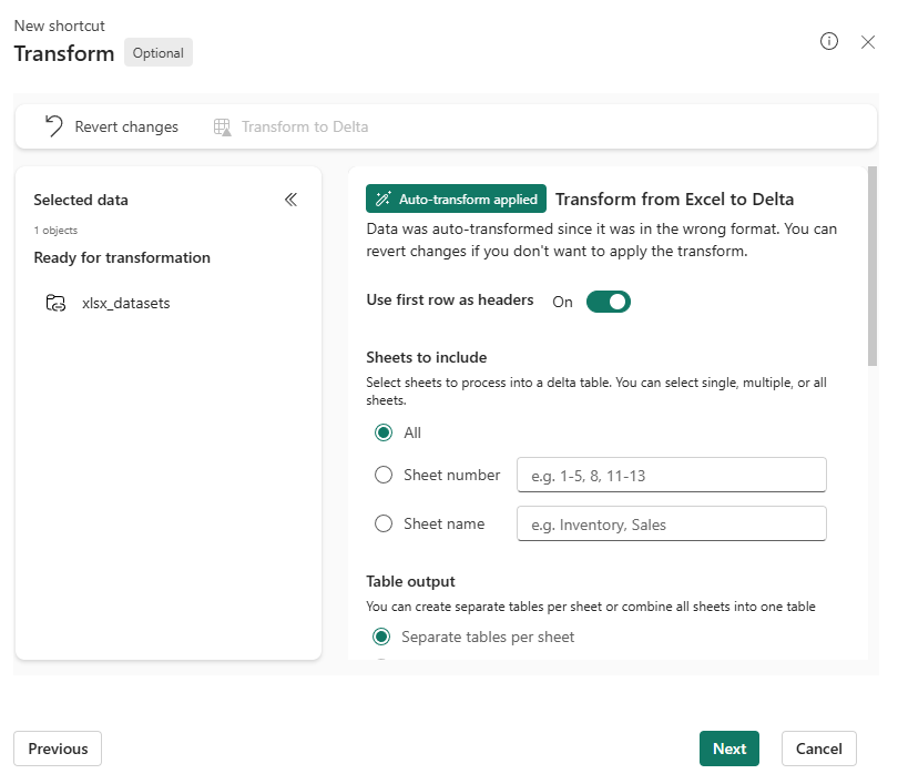 Useilla taulukoilla varustetuissa Excel-tiedostoissa taulukon pikakuvake yhdistää valitut taulukot yhdeksi Delta-taulukoksi. Jos tarvitset yhden Delta-taulukon per arkki, luo sen sijaan skeeman pikakuvake .