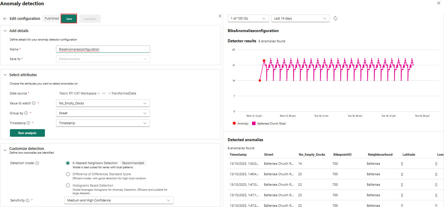 BikeAnomaliesconfigurationnimi.Tallenna to -kohdasta valitse Luo tunnistin.