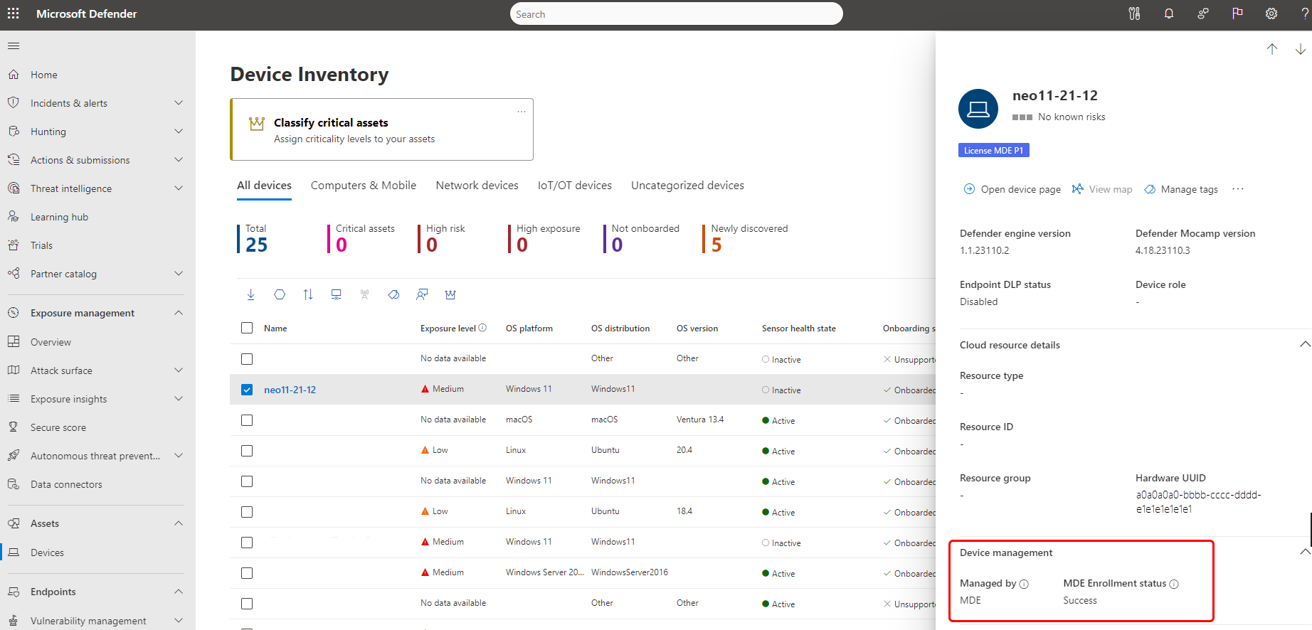 You can also confirm a device is enrolled in security settings management successfully by confirming that the device-side panel or device page display MDE Enrollment status as Success.
