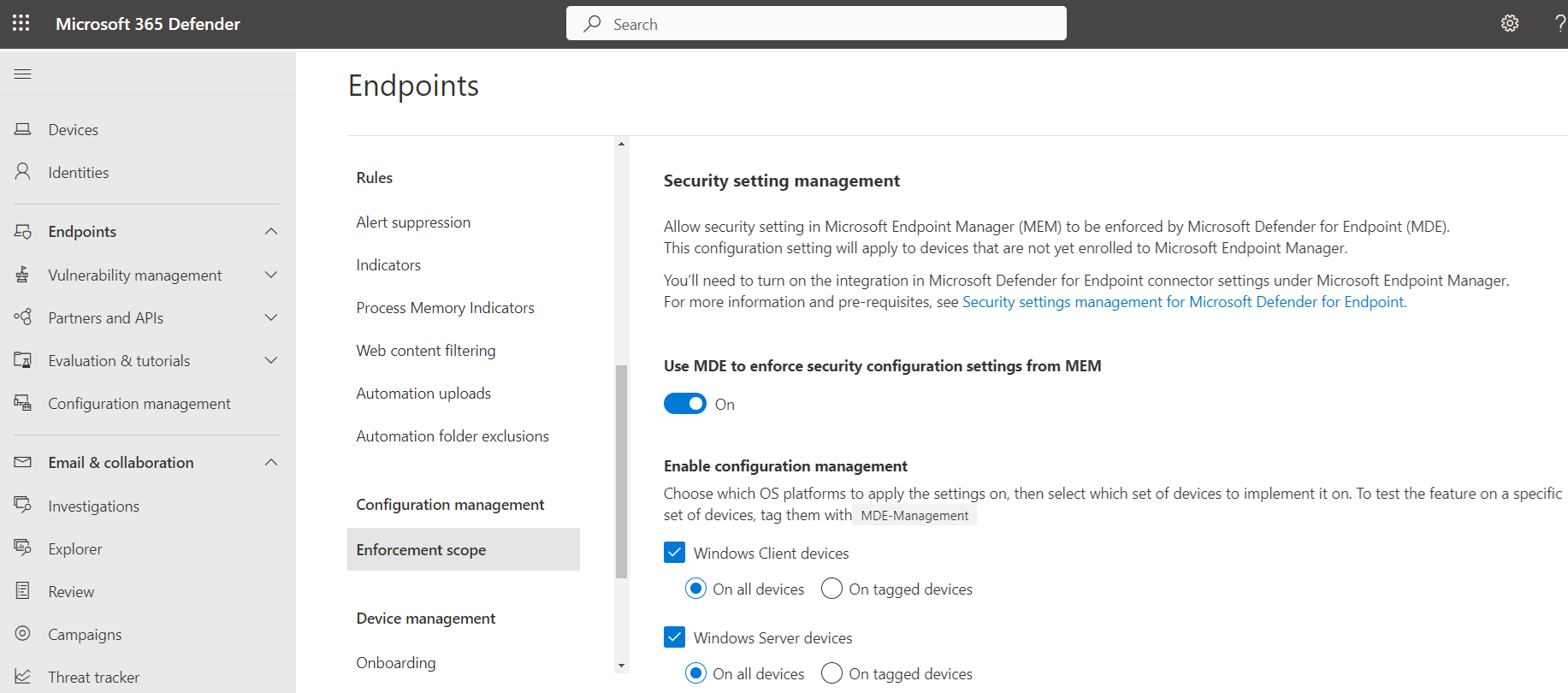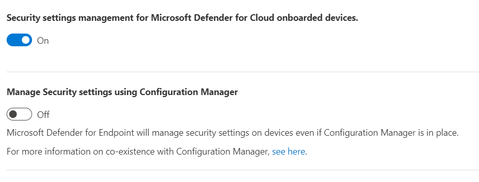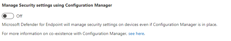 To support this, configure the Manage Security settings using Configuration Manager toggle to Off. Sign in to the Microsoft Defender portal and go to Settings > Endpoints > Configuration Management > Enforcement Scope: