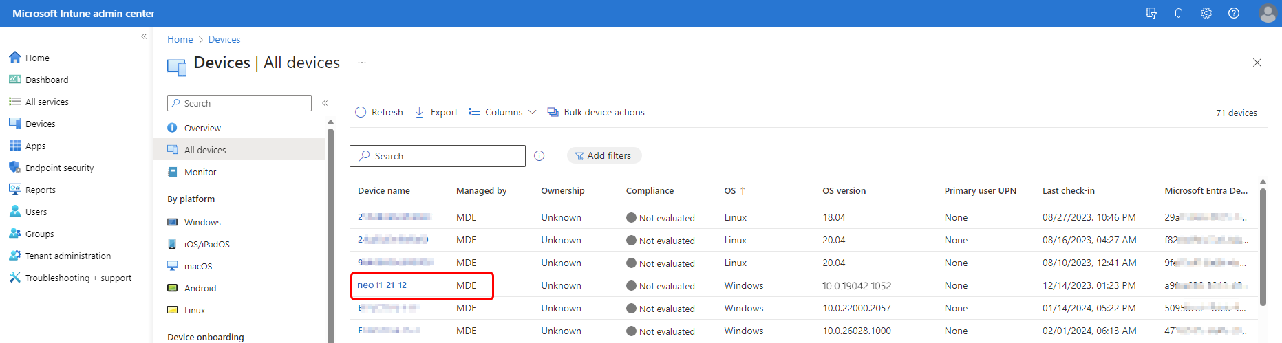 - From within the Microsoft Intune admin center go to Devices > All devices, select a device that displays either MDEJoined or MDEManaged in the Managed by column, and then select Delete.