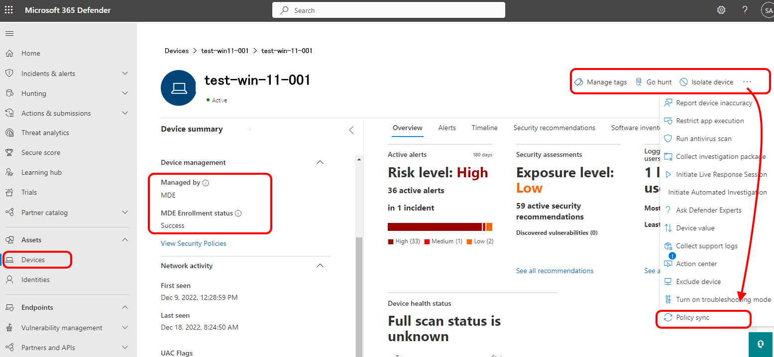 The Policy sync button only appears for devices that are successfully managed by Microsoft Defender for Endpoint.