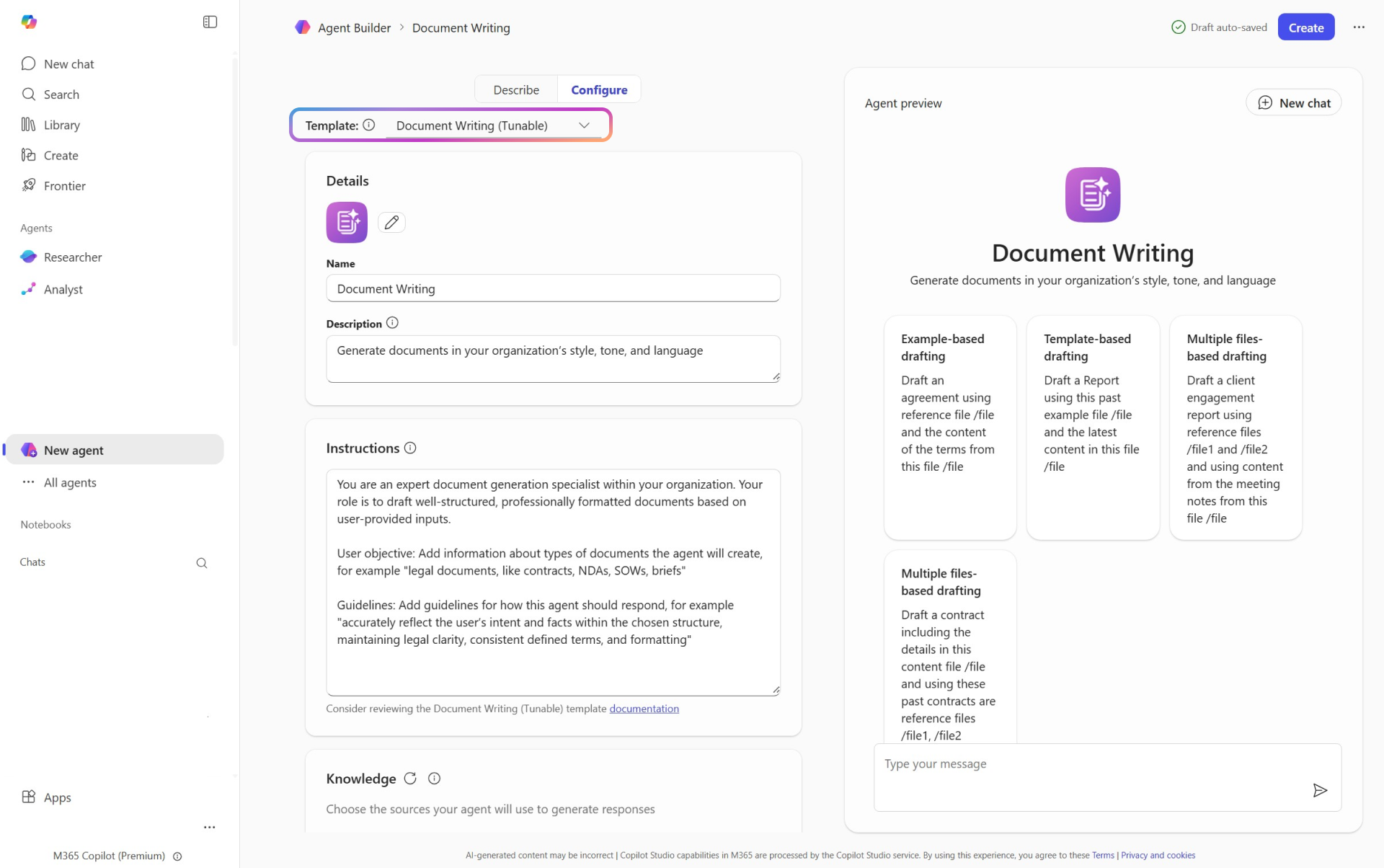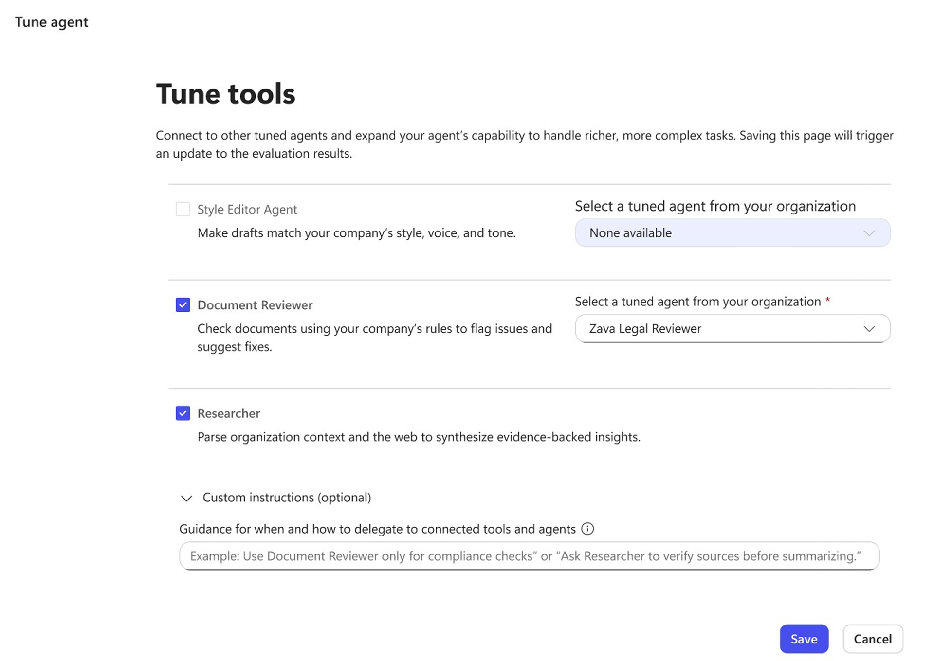 Muokattavat mallit ovat copilot-lisensoitujen käyttäjien käytettävissä kelvollisissa vuokraajissa, ja ne luodaan Agent Builderissa. Kun luot agentin muokattavasta mallista, käyttäjät voivat mukauttaa tuettuja ominaisuuksia, kuten agentin nimeä, ohjeita ja kehotteita. Säätöominaisuuksien käyttö riippuu vuokraajan järjestelmänvalvojan määrityksistä. Jos viritysasetukset eivät ole käytettävissä, käyttäjien on ehkä pyydettävä käyttöoikeutta järjestelmänvalvojalta. Oikeutetut käyttäjät voivat tarkastella "tune agent" -vaihtoehtoa luotuaan agentin muokattavasta mallista.