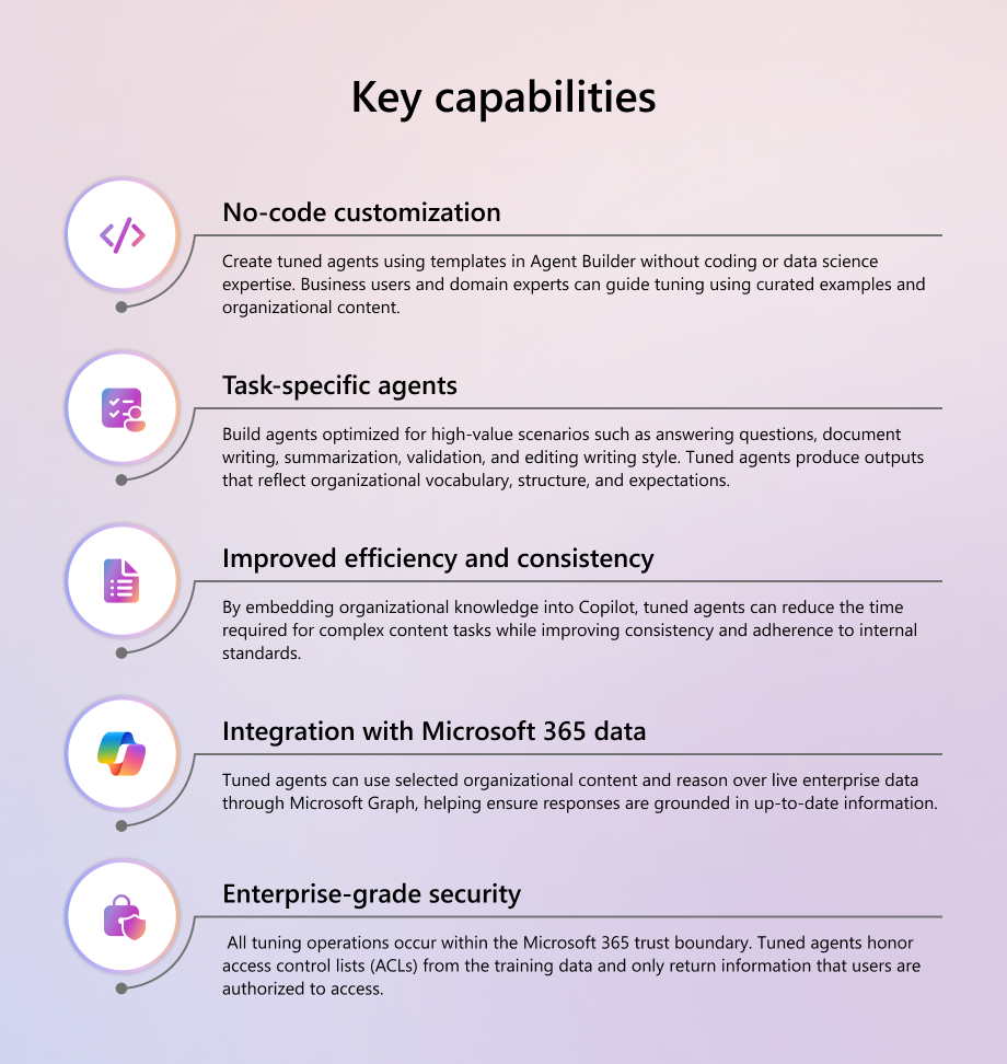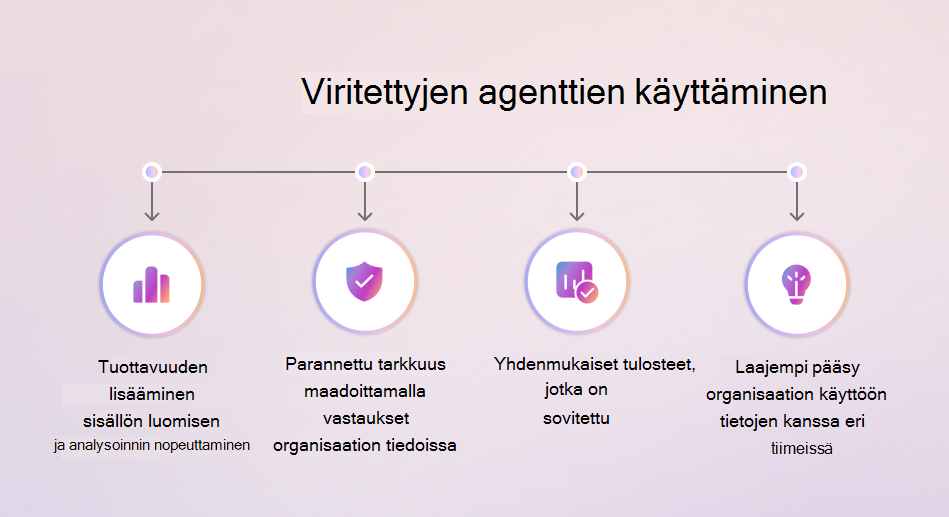 Toisin kuin yleiskäyttöiset tekoälykokemukset, viritetut agentit on suunniteltu tiettyjä, toistettavissa olevia tehtäviä varten. Koska ne toimivat kokonaan Microsoft 365 -vuokraajassa, organisaation tiedot pysyvät suojattuina olemassa ajalla suojaus, vaatimustenmukaisuus ja hallinto.