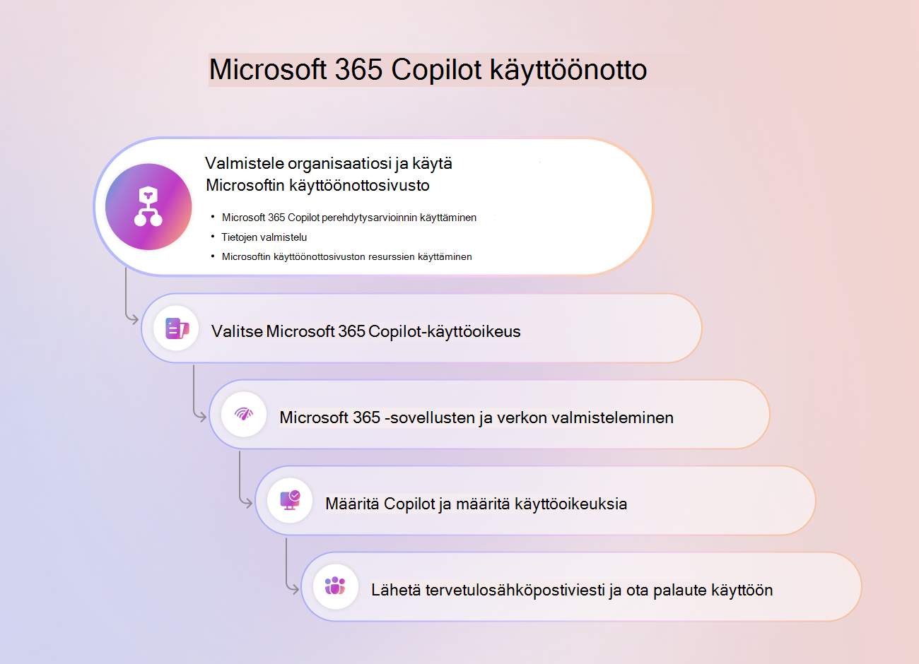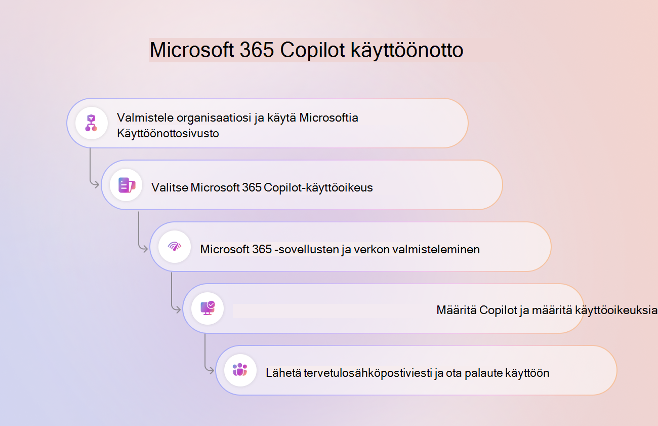 Tässä artikkelissa on yleiskatsaus vaiheista ja resursseista, joiden avulla voit ottaa käyttöön ja aloittaa Microsoft 365 Copilot käytön organisaatiossasi.