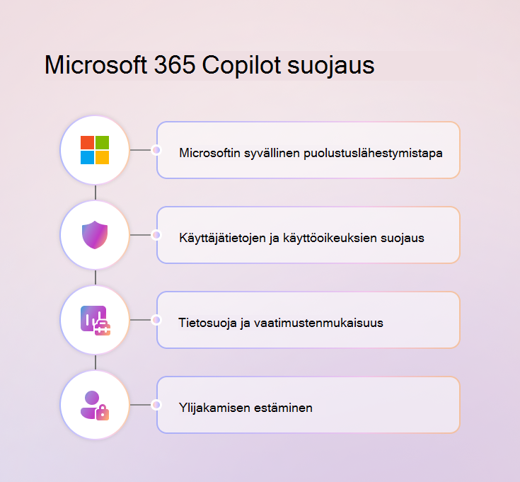 Microsoft 365 Copilot kunnioittaa organisaatiosi nykyisiä suojaus- ja tietosuojan hallintatoimia. Copilot käyttää vain tietoja, joihin käyttäjillä on käyttöoikeus, ja se noudattaa Microsoft 365:n yhteensopivuus-, tietosuoja- ja tietojen sijaintisitoumuksia.