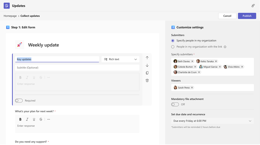 Anyone can create an update request and ask others to submit updates to sync their work status. They can also add people as Viewers to review the update submissions.