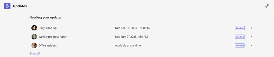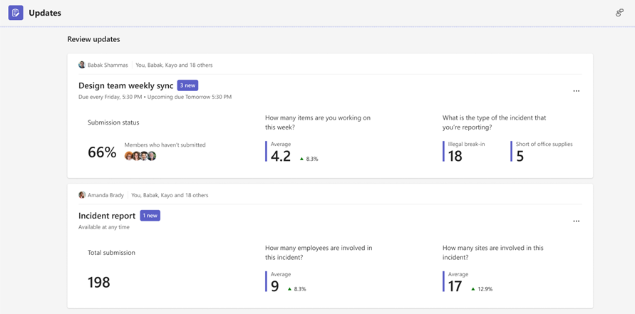 The Updates app in Microsoft Teams provides a centralized place for members of your organization to create, review, and submit updates. By creating update requests, you can use the Updates app to keep track of anything your organization needs. Updates are available for both desktop and mobile.