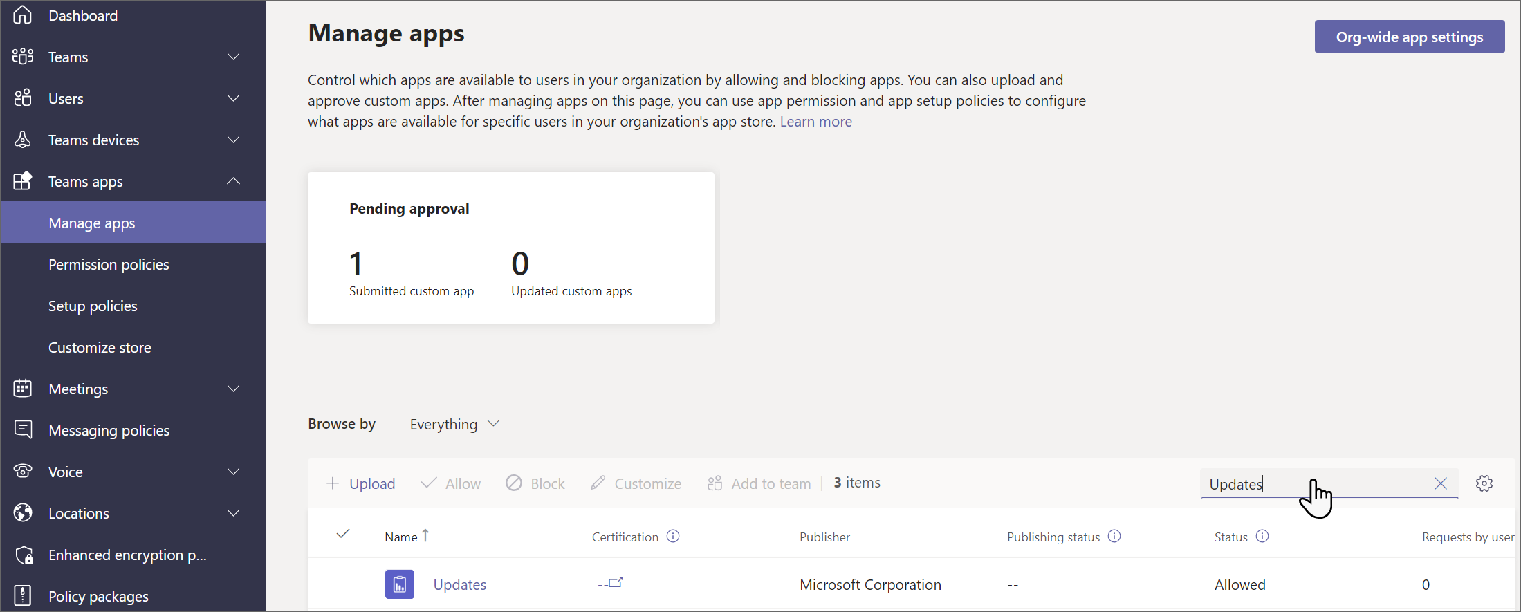 In the left navigation of the Teams admin center, go to Teams apps > Manage apps.