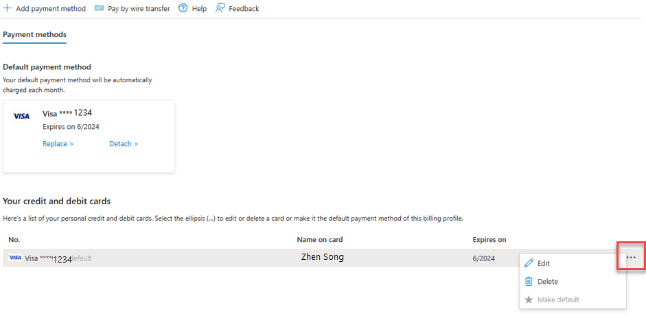 In the Your credit and depit cards section, at the end of the credit card description, select the three dots menu (...). From here, you can either edit the existing card, or delete it.