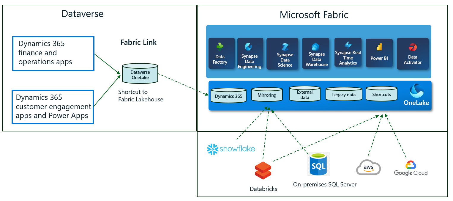 - Dataverse sisältää sisäänrakennetun OneLake-säilön. Dynamics 365:n ja Power Appsin operatiiviset tiedot replikoidaan sisäiseen Lake-säilöön lähes reaaliaikaisesti (jotta ei vaikuta operatiivisiin työmääriin) ja linkitetään turvallisesti Fabriciin oikopolkujen avulla. Azure-tallennustilaa ja vietyjä suojattuja tietoja ei tarvitse tuoda. Tiedot eivät poistu Dataverse-hallintorajaa, ja Fabricin valtuutetut käyttäjät voivat käyttää tietoja käyttämällä kaikkia Fabric-työkuormia.