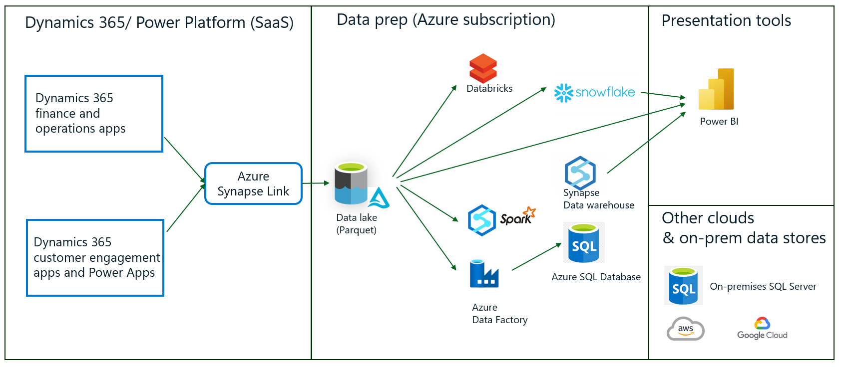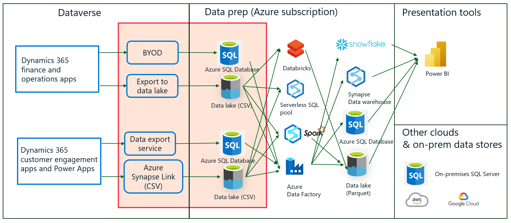 Jos olet vanhojen palveluiden BYOD-, tietojen vientipalvelu- tai Data Lakeen vieminen -asiakas, sinulla voi olla tietojen integrointiarkkitehtuuri, joka muistuttaa tässä esitettyä arkkitehtuuria. Korostettu ruutu ilmaisee, mitä tietoputkia organisaatiosi on ehkä rakentanut Dynamics 365:stä ja Dataversesta vietyjen tietojen hyödyntämiseksi. Microsoftin ja muiden työkalujen avulla voit kopioida Dynamics-tietoja ja ja integroida niitä omiin tietoihisi. Voit myös muuntaa ja yhdistää tietoja kopioimalla niitä useisiin säilöihin, jotka näkyvät kaavion tietojen valmisteluruudussa. Voit visualisoida tietoja ja luoda toimintaa ohjaavia oivalluksia Power BI:llä tai muulla työkalulla. Järjestelmässä voi olla putkia, joiden avulla voi viedä tietoja paikalliseen järjestelmään ja muihin pilvipalveluihin.