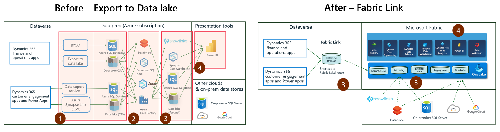 Tämän artikkelin toimintaa edeltävässä ja sen jälkeisessä kaavioissa näytetään, miten asiakas poisti Data Lakeen vientipalvelun käytöstä (1) sekä valmisteli tietosäilöt (2) Fabric-linkin avulla. Toimintanäkemyksissä (4) kulutetaan OneLake-tietoja suoraan Power BI:ssä. Jotkin tiedot edellyttävät tietojen yhdistämistä, muunnosta ja koostamista (3). Erillisten Azure-palveluiden käyttämisen sijaan, ne standardoitiin samoille työkaluille, jotka löytyvät Fabricista.