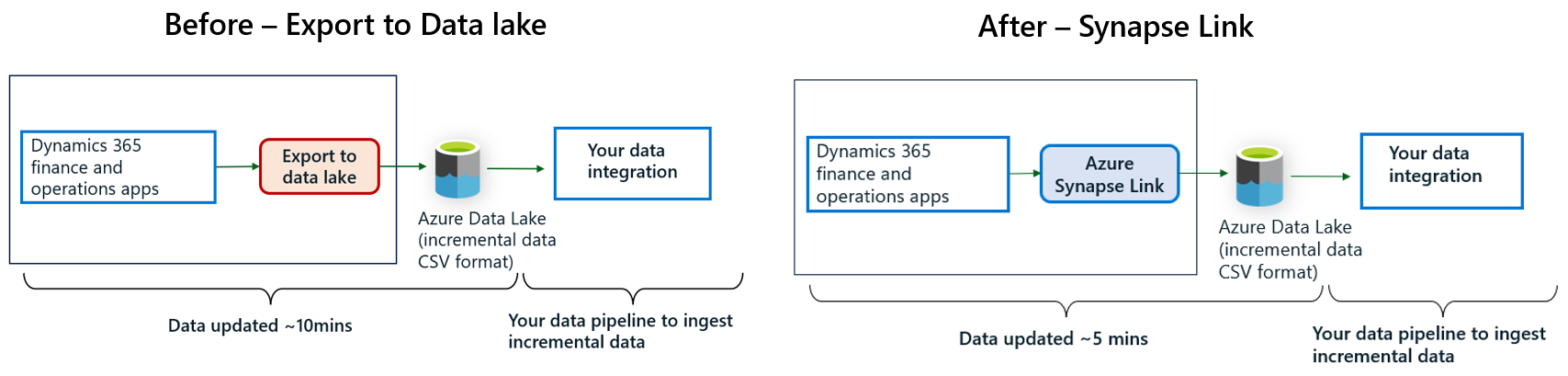 - Azure Synapse Link vie tiedot samassa muodossa kuin Data Lakeen vieminen tai oman tietokannan tuonti, mikä mahdollistaa aiemmin luotujen putkien säilyttämisen.