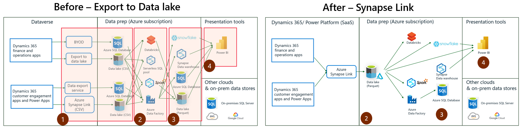 Näissä siirtymää edeltävässä ja sen jälkeisessä kaavioissa näytetään, miten asiakas poisti Data Lakeen vientipalvelun käytöstä (1) sekä valmisteli tietosäilöt (2) Azure Synapse Linkin avulla. Tietojen väliaikaista tallennusta varten käytettävät tietosäilöt, kuten välittävät Azuren SQL -tietokannat, poistetaan käytöstä, koska Dataverse-tiedot tallennetaan Delta- tai Parquet-muodossa, mikä on suorituskykyisempi ja tiivistetympi tietomuoto. Tietojen yhdistämisessä, muuntamisessa ja koostamisessa (3) käytetyt prosessin loppupään putket sekä esitystyökalut (4), kuten Power BI, eivät muutu.